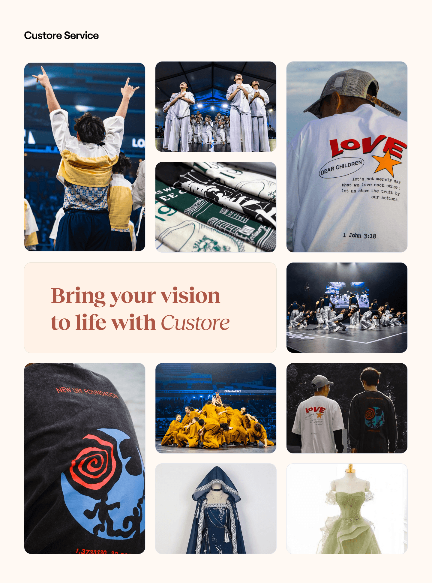 Turn your ideas into reality by connecting with our community of Talents using our Custore Service. Say goodbye to endless research, confusing fashion jargon, and time-consuming back-and-forths. Our streamlined process is efficient, safe, and secure—delivering the results you want, faster.